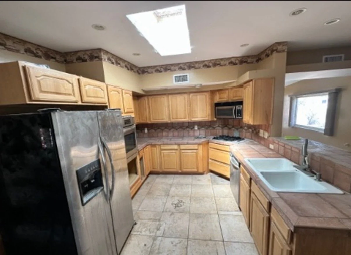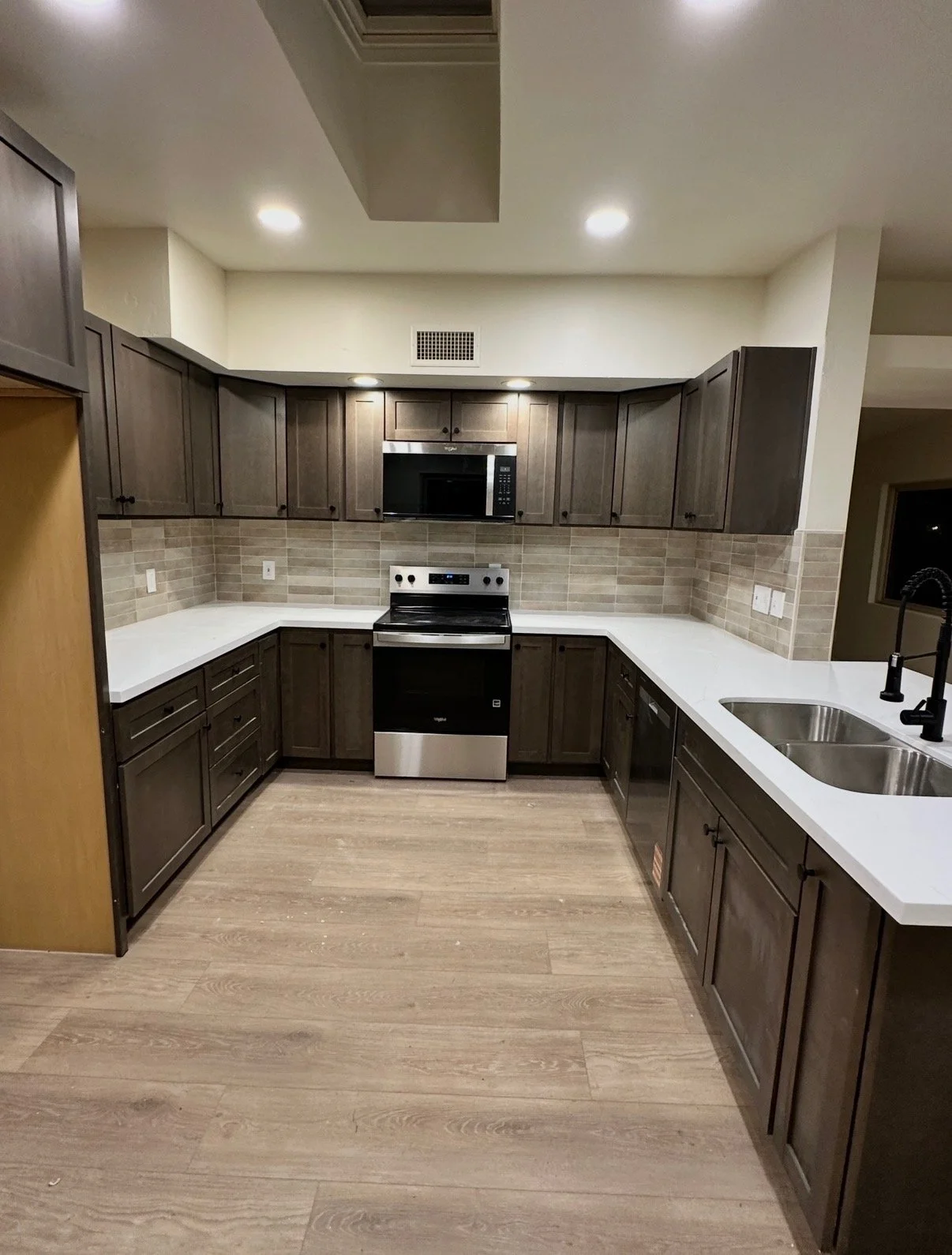 Full kitchen remodel, removing old flooring, installing new tile flooring, install installing new cabinetry and appliances full new plumbing line set from main throughout the house AFTER BEFORE